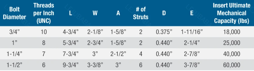 .Table is based on 3,000 psi and 145 PCF concrete. .Minimum spacing of inserts is 2 x (corner distance).