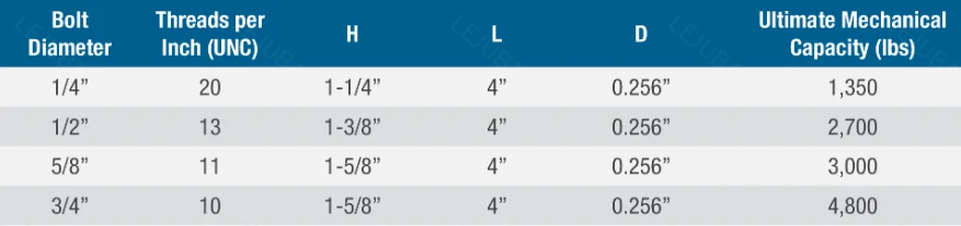 .Table is based on 3,000 psi and 145 PCF concrete.