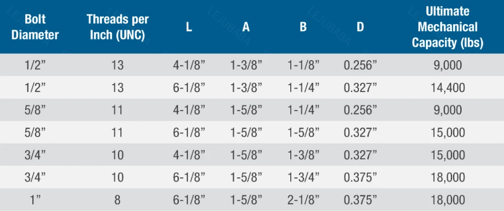 .Table is based on 3,000 psi and 145 PCF concrete. .Inserts must be set back 1/2” from concrete surface. .Above capacities are based upon mechanical testing and available industry data. .Minimum spacing of inserts is 2 x (corner distance).